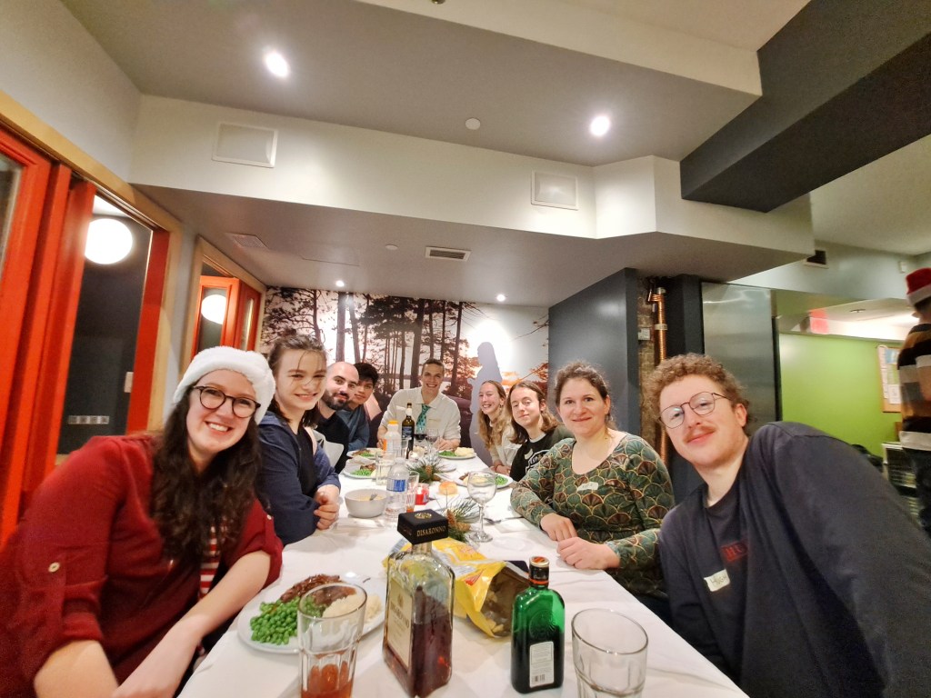 On Christmas Eve, three of us went for a walk through Downtown and ended up in one of the Eaton Centre. They have the biggest indoor Christmas Tree in North America there – standing at nearly 35m high. The tree itself is already pretty impressive but what really added the Christmas magic was the lights show that plays out for 3 minutes on the tree itself, ending in ‘snow’ falling from the roof so I felt like I really was in a winter wonderland. The hostel staff put on a Christmas dinner for everyone staying in the hostel on Christmas Eve so once we got back to hostel, we helped the staff to chop and prep the biggest pile of potatoes and butternut squash that I have ever seen. However, the saying ‘many hands make light work’ is pretty accurate and we got through it all in record time. To be honest, helping prepare vegetables with friends was probably the point at which I felt the most Christmassy. When I spend Christmas at my family home, I usually end up helping my mum prepare the meal – chopping and peeling veg or shelling sprouts – and so helping out at the hostel was actually a huge part of my Christmas experience, and a lot of fun. The meal itself was a really fun time, and I learned a new game where you try and flip whipped cream from the back of your hand and catch it in your mouth. Anyone who knows me will vouch for the fact that my hand-eye co-ordination sucks so you can make a pretty good guess at how successful I was at this game.